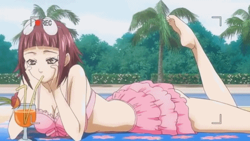 [She sighed happily as he rested by the side of the pool, cuddling her towel.]